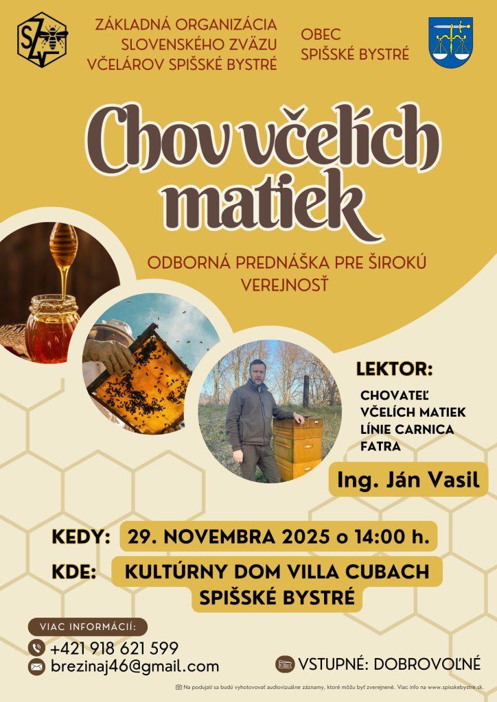 Srdečne vás pozývame na odbornú prednášku zameranú na tému CHOV VČELÍCH MATIEK, ktorá je určená pre širokú verejnosť – pre skúsených včelárov, nadšencov, ale aj úplných začiatočníkov.