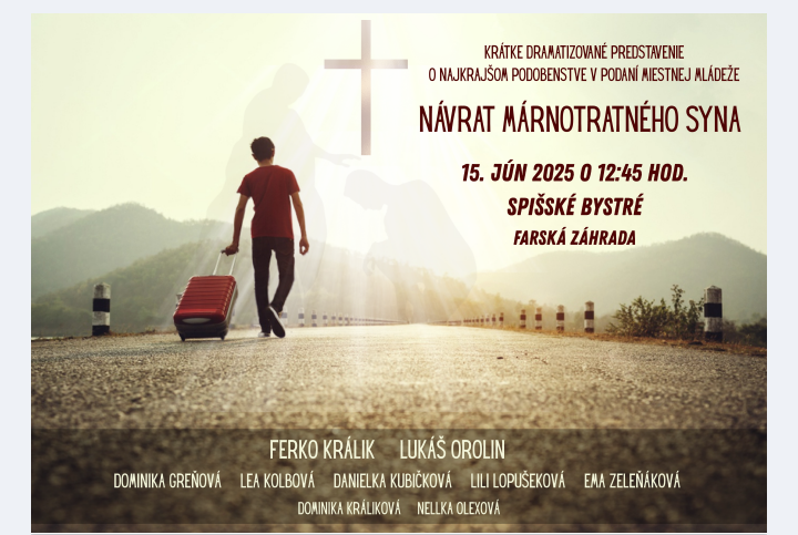 11:00 – 14:00 hod. - farská záhrada: hra pre celú rodinu, vystúpenie kresťanských raperov MT a DaFča (12:00 hod.), divadelná scénka Návrat márnotratného syna (12:45 hod.), súťaž v predvádzaní detských ukazovačiek, tombola